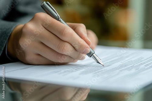 Close-up of entrepreneur signing documents with a pen, detailed paperwork visible, clean professional setup, photorealistic clarity
