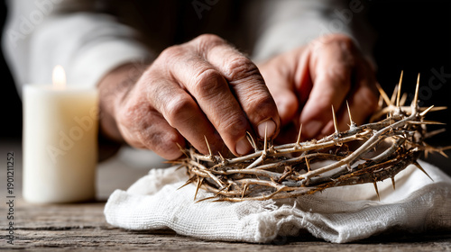 Close-up of faceless hands placing a crown of thorns on a white cloth next to a candle, Religious Easter Symbolism, focus on the sharp texture and soft fabric, dramatic lighting, w