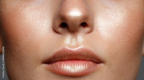 Close-up of female face with luminous skin detailed lips and nose studio setting beauty photography portrait focus
