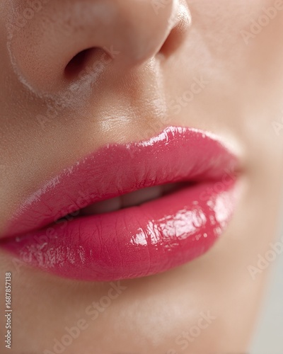 Close-up of female model & elegant lips with radiant bright and vibrant color lips holding lipstick tube, professional beauty shoot for cosmetic, advertising and luxury makeup brand promotion