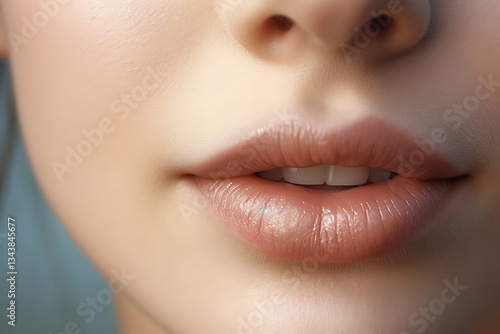 Close-up of female plump natural lips with a minimalistic aesthetic, showcasing realistic texture, soft natural lighting, and a subtle shine