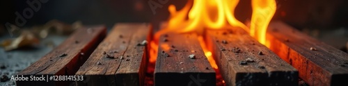 Close-up of flame through grilled wooden pieces, grill, sparks