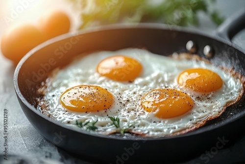 egg, fried, breakfast, yolk, white, black, pan, frying, cooking, food, kitchen, meal, tasty, delicious, healthy, protein, iron, vitamin, dietary, morning, lunch, dinner, alimentary, fresh, pepper, spice, favor, grease, oil, butter, cooked, gold, round, circle, plate, hot, warm, appetising, simple