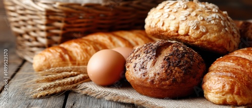 Close-up of Freshly Baked Bread and Eggs Displayed in Rustic Setting on Wooden Tabletop with Wheat Stalks