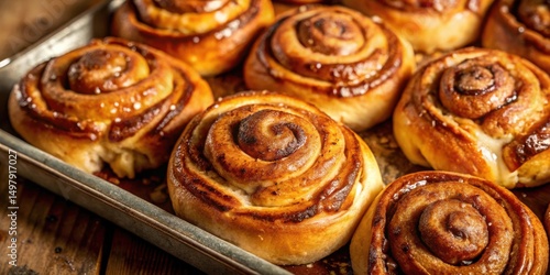 Close-up of freshly baked cinnamon rolls with a golden glaze, arranged on a baking sheet, showcasing their soft and inviting texture