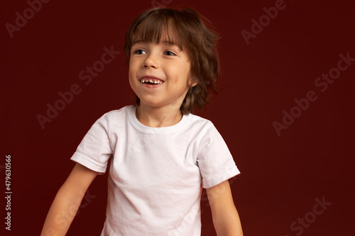 portrait, red, face, studio, people, beautiful, hair, cute, casual attire, background, attractive, caucasian, fun, male, toothy, boy, clothes, person, children, funny, positive, excited, brown, happiness, european, 1, model, looking, stylish, happy, cheerful, white, smile, isolated, expression, playful, copy space, red wall, smiling, brunette, little, merry, aside, casual attire, schoolboy, kindergartner, son, man, small