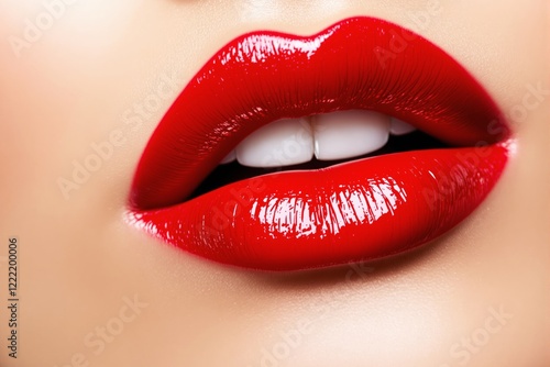 Close-up of glossy red lips with perfect teeth on a smooth skin background.
