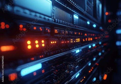 Close-up of glowing server racks with orange and blue LED indicators, symbolizing active data operations. Great for visuals on IT, databases, and tech infrastructure