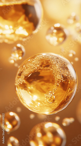 Close-up of golden liquid bubbles in fluid medium, detailed and abstract composition with spherical shapes and luxurious golden hue