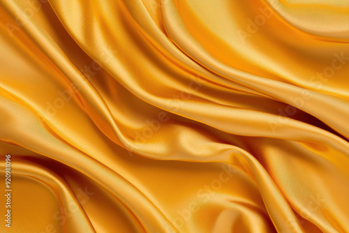 Close-up of golden silk fabric with smooth folds and luxurious texture, creating an elegant and rich background for various uses.