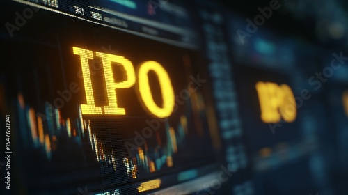 Close-up of golden stock market ticker displaying IPO with financial charts, symbolizing investment opportunities and capital market growth. Financial business and trading concept.