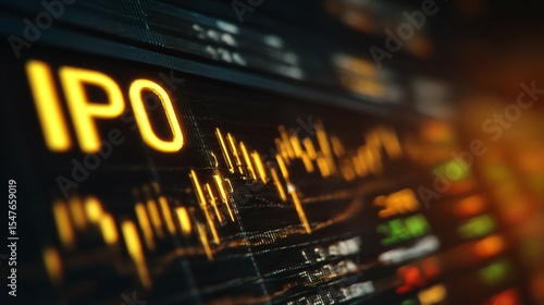 Close-up of golden stock market ticker displaying IPO with financial charts, symbolizing investment opportunities and capital market growth. Financial business and trading concept.