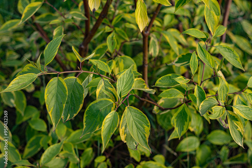 Close-up of green and yellow variegated white dogwood leaves (Cornus alba) on branches, illuminated by soft light, showcasing the vibrant foliage in a natural setting.