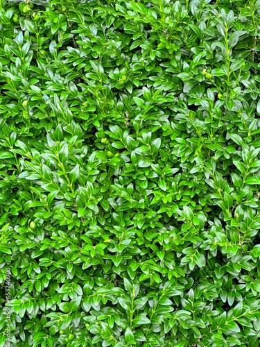 Close-up of green leaves wall. Boxwood bush texture. Top view of Buxus Sempervirens. Green natural background for any theme.