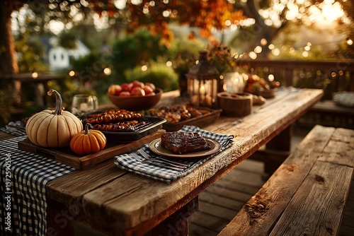 Close-up of grilled food, pumpkins, apples arranged on wooden picnic table.