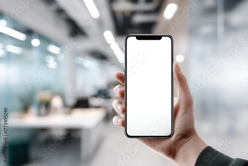 Close-up of hand holding a modern smartphone with empty white display, set against blurred background of contemporary office space.