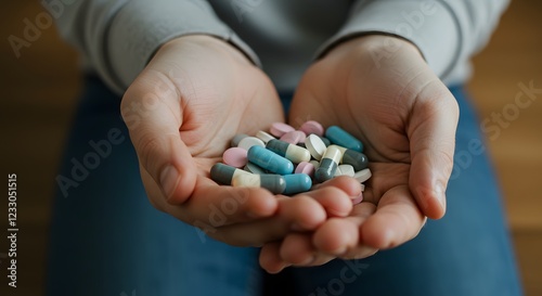 Close-Up of Hand Holding Colorful Pills Against Blurred Living Room Background, Minimal Health Concept