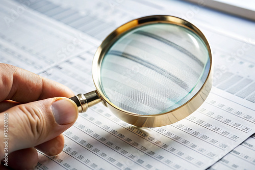 closeup, hand, holding, magnifying glass, paperwork, finance, business, exam, analysis, review, inspection, scrutiny, document, close-up view, magnification