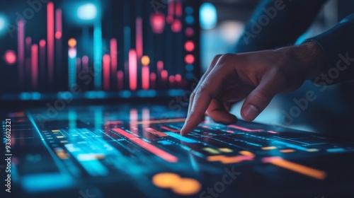 hand, digital, interface, screen, datum, graph, technology, touch, interaction, high-coloured, colours, closeup, glowing, futuristic, modern, abstract, cyber, network, programming, information, visualisation, dashboard, business, finance, stock, market, trade, investment, design, graphic, line, chart, dark, blue, red, orange, yellow, light, blur