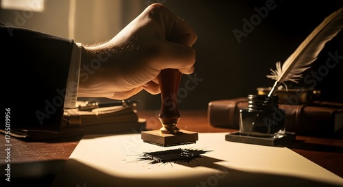 hand, stamping, document, wax, seal, vintage, office, closeup, ink, desk, feather, quill, paper, authorisation, approval, emboss, traditional, formal, legal, official, antique, signature, brown, light, wood, pen, writing, working, manual, authentic, old-fashioned, authenticity, detail, craftsmanship, sharpened, tradition, stationery, artistic, composition, creativity, shadow, texture
