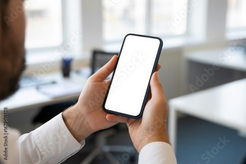 Close-up of hands holding a modern smartphone with a blank white screen, suggesting a user interacting with technology in a professional environment.