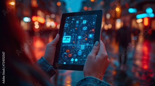 Close-up of hands holding a tablet with augmented reality icons floating over a city street scene at night.