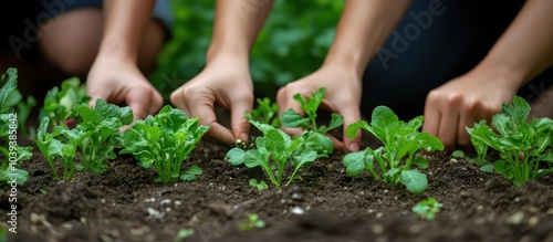Closeup of hands planting young seedlings in fertile soil.