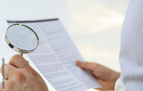 magnifying glass, document, contract, review, detail, analysis, inspection, attention, sharpened, accuracy, careful, precise, research, investigation, scrutiny, paper, reading, work, business, finance, law, legal, closeup, hand