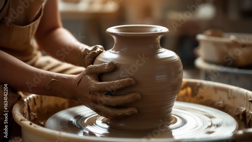 pottery, clay, hand, shaping, wheel, ceramic, craft, artisan, creation, making, vessel, vase, art, artist, studio, workshop, wet, mud, spinning, process, skill, talent, traditional, hand-made, craftsmanship, detail, texture, form, shape, design, creative, hobby, leisure, occupation, work, sharpened, concentration, dedication, passion, earthy, brown, natural, organic, smooth, radial, line, motion, blurred, background