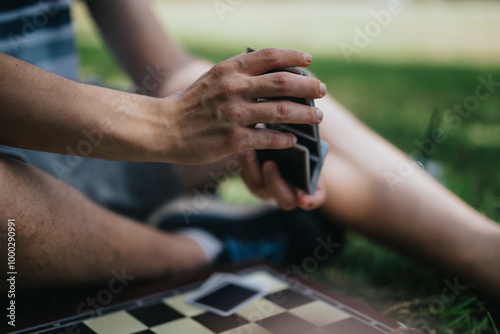 Close-up of hands shuffling cards in a relaxed outdoor setting, depicting leisure and play under natural sunlight.