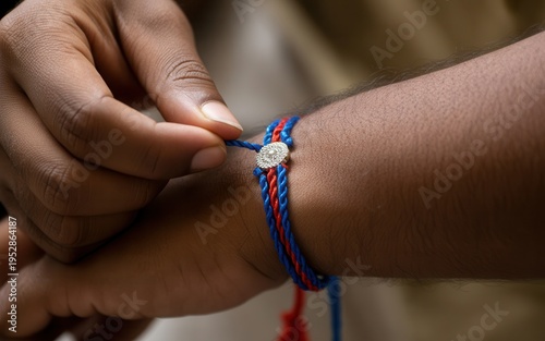 new, latest, high-quality, bracelet, hand, wrist, blue, red, cultural, symbolic, love, protection, colourful, closeup, person, tying, vibrant, bokeh, background, blurred, human, human relationships, festival, celebration, india, asian, people, emotion, bonding, tradition, ritual, ceremony, hand-made, jewellery, accessory, fashion, texture, skin, finger, thumb, indexed, cord, thread, woven, detail