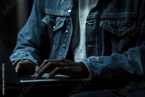 laptop, hand, typing, keyboard, finger, denim, jacket, closeup, person, man, technology, computer, cyberspace, digital, work, office, home, night, dark, low light, screen, datum, code, programming, online, social, media, network, connection, communication, information, search, web, electronic mail, message, business, project, design, sharpened, detail, effort, skill, style, male, adult