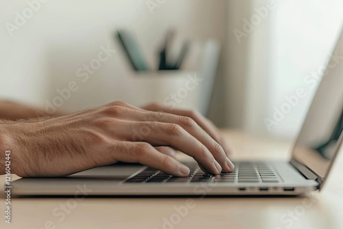 closeup, hand, typing, sleek, laptop, minimalist, home, office, desk, remote, work, essential, blurred, supply, background, ensure, ample, copy space, unique, empty space, visual, texture, scene, professional, inspiration, modern, sharpened, abstract, high-quality, simplicity, design, detail, colours, art, style, minimal, concept, creative