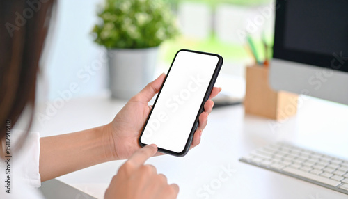 Closeup of Hands Using Smartphone Mockup on Office Desk with Laptop and Workspace