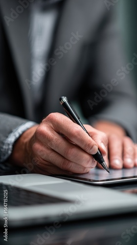 hand, writing, tablet, pen, business, man, grey, suit, work, document, digital, note, close, sharpened, detail, laptop, desk, office, professional, modern, technology, equipment, workstation, closeup, finger, holding, black, crayons, scribble, input, datum, information, drawing, sketching, detail, corporate, businessperson, activity, task, focused, attention, serious, productivity, engagement, action