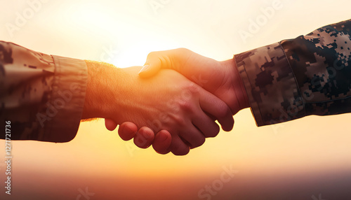 Close-up of handshake between military and civilian at sunrise, symbolizing unity and cooperation.