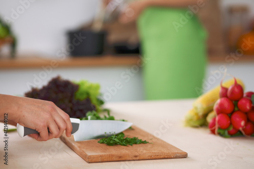 cooking, hand, kitchen, woman, table, salad, herb, wooden, board, knife, cook, chop, slice, cut, culinary, apron, food, home, standing, meal, green, vegetarian, concept, healthy, fresh, closeup, dinner, ingredient, pepper, female, closeup, vegetable, natural, red, vitamin, ingredient, nature, diet, chef, nourishment, health, menu