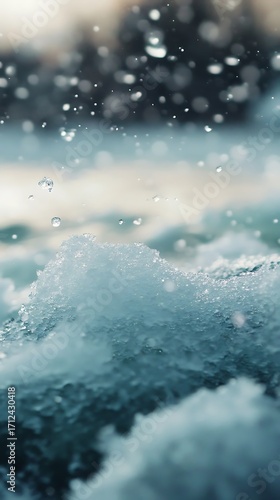 Close-up of Ice Formation with Water Droplets and Bokeh Background Keywords: ice, ice photo