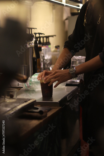 Closeup of Iced Caramel Macchiato at the coffee shop, Caramel Macchiato is a classic macchiato beverage. It consists of vanilla syrup, espresso, steamed milk, foam, and caramel drizzle