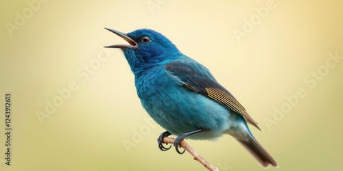 Close-up of indigo bunting's head and beak as it sings from a thin branch against a serene green and creamy environment, natural world, greenery