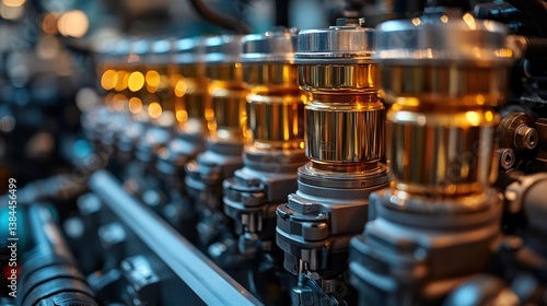 Close-up of industrial engine components. Gold-toned engine parts in a machine, lined up, with blur in background.