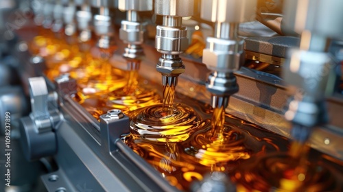 Close-up of industrial machinery with fluid dynamics in a manufacturing process.
