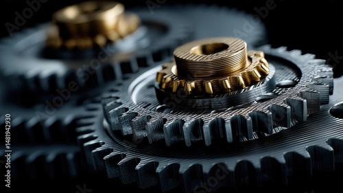 gear, metal, machine, machinery, technology, engineering, industry, mechanism, interlocking, precision, dark, background, closeup, texture, detail, gold, grey, cog, wheel, part, industrial, system, work, process, movement, motion, complex, intricate, design, abstract, concept, power, strength, efficiency, connection, collaboration, teamwork, synchronization, coordination, manufacturing, production, mechanic, hardware, pattern, geometric, shape, metallic
