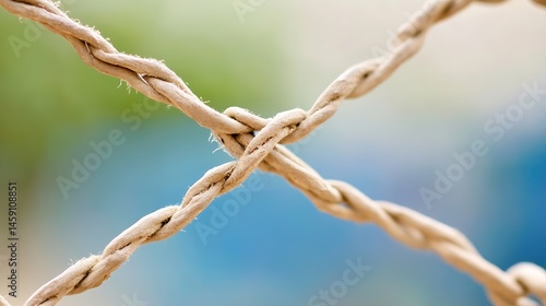 Close-up of intertwined beige rope strands, creating a textured x-shaped pattern against a blurred green and blue background. The image evokes feelings of connection and strength. : Generative AI