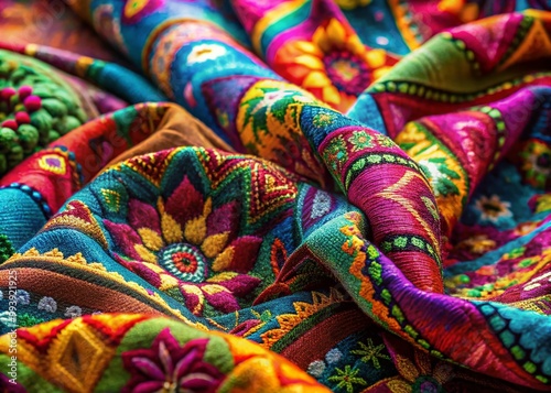Close-up of intricate fabric texture showcasing patterns in a rich, vibrant color palette for design