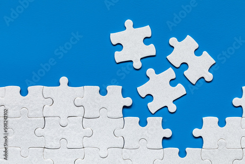 Closeup of jigsaw puzzle isolated. Missing jigsaw puzzle piece, business concept for completing the puzzle piece. Group of puzzle and a puzzle piece. Teamwork concept. Think difference concept.