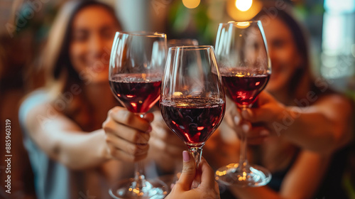 Close-up of joyful female friends clinking wine glasses at a vibrant gathering, relishing each other's company in a chic bar ambiance, epitome of camaraderie and shared delight.