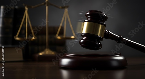 Close-Up of Judge’s Gavel Striking Sound Block in Courtroom with Scales of Justice and Law Books Under Dramatic Focused Lighting”