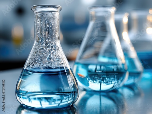 Close-up of laboratory glassware containing blue liquid in scientific research environment with blurred background