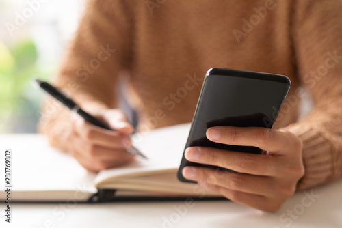 Close-up of lady writing out information from phone message. Unrecognizable businesswoman making notes in diary and viewing online file on smartphone. Gadget concept